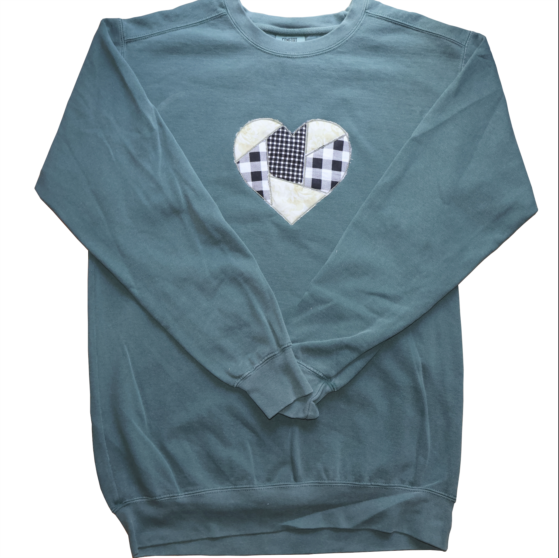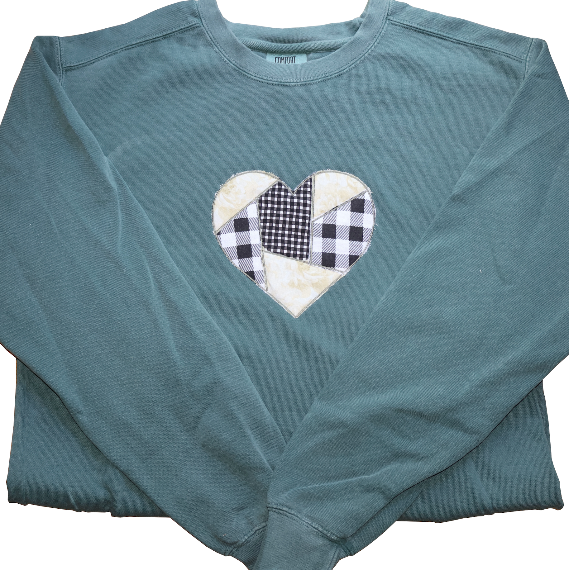 A cozy green sweatshirt featuring a heart design made with layered appliqué embroidery. The heart is pieced together from floral and gingham fabrics, giving it a playful and unique patchwork look. Only 1 sweatshirts made with this color pattern. (1 of 1)