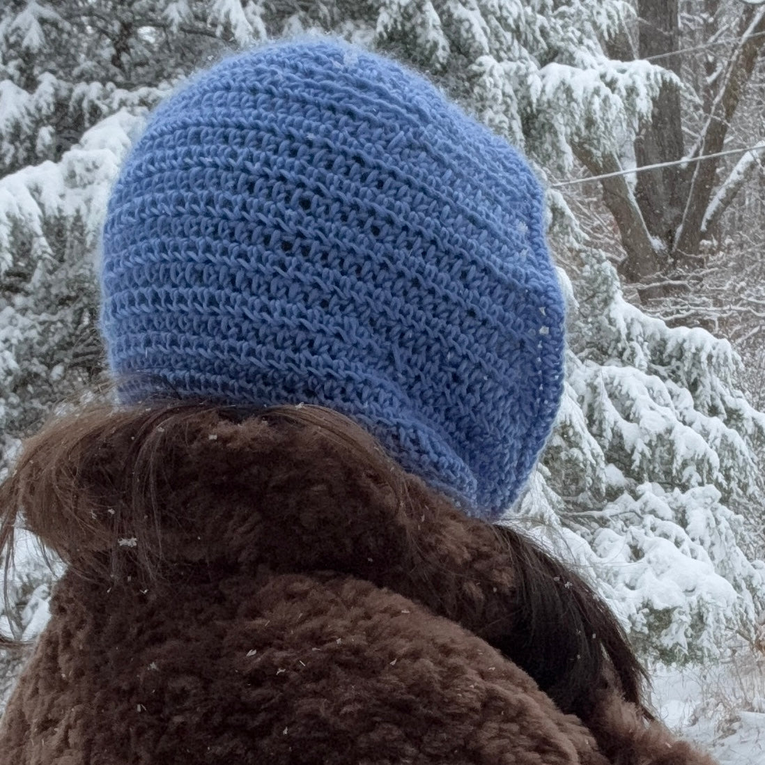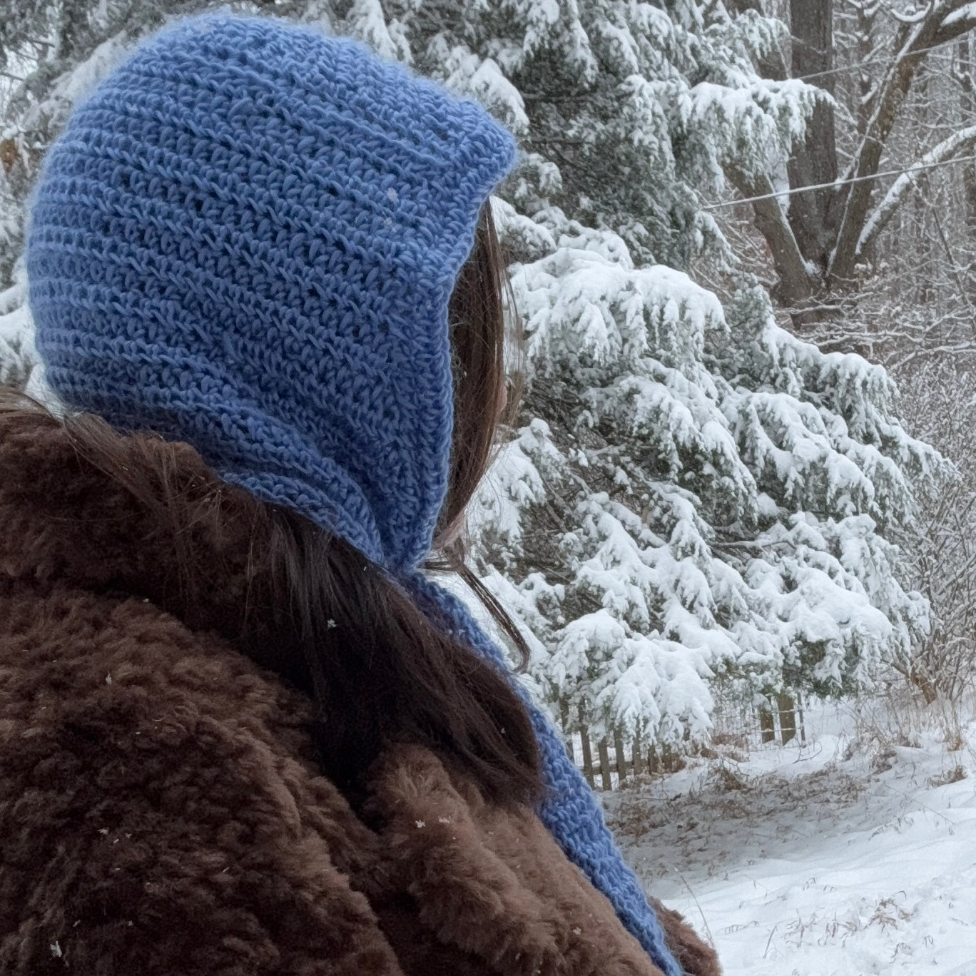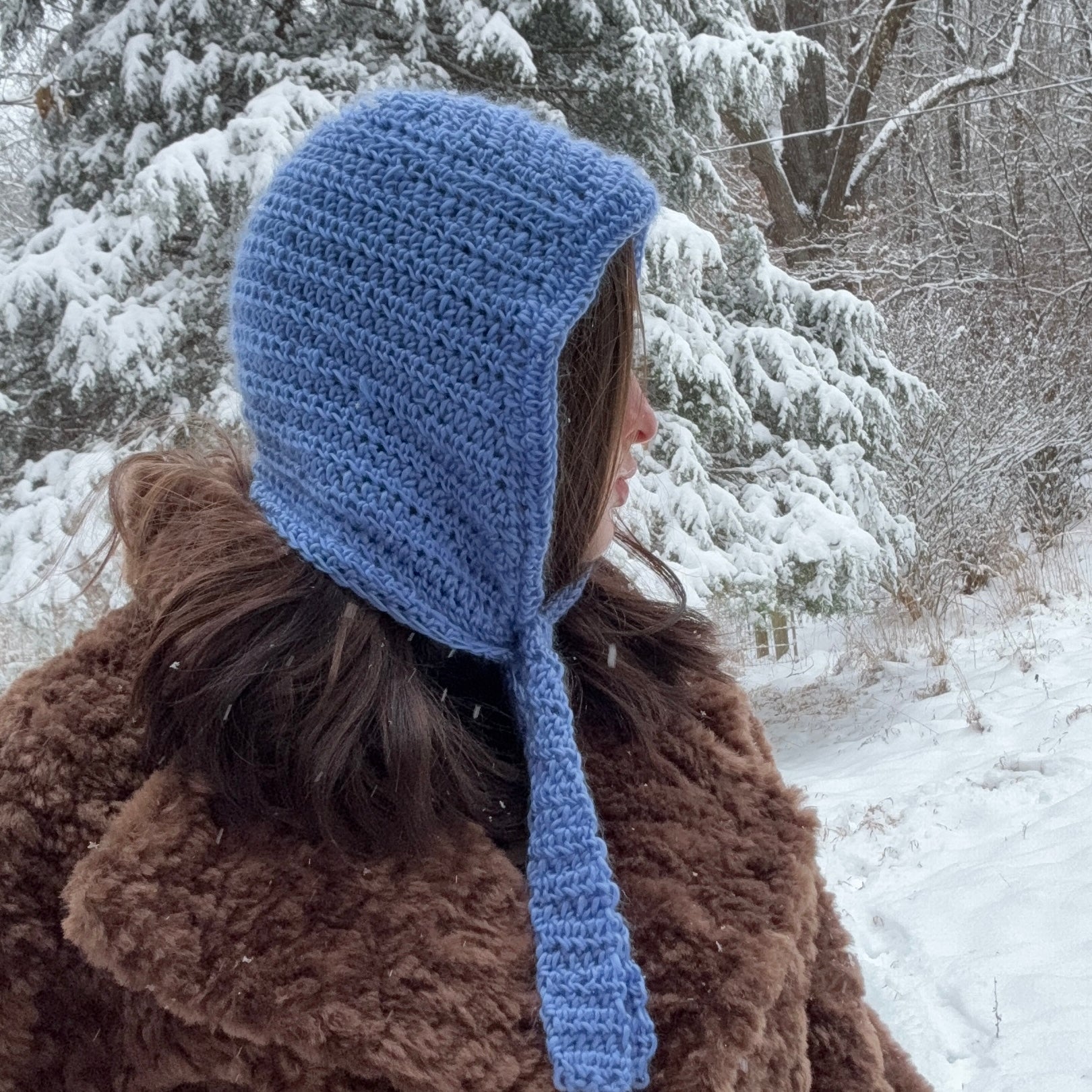 This handmade bonnet is crocheted with soft yarn. Warm, stretchy, and incredibly cozy makes this bonnet the perfect everyday winter staple. Hood with small scarf ties to make snug around face.