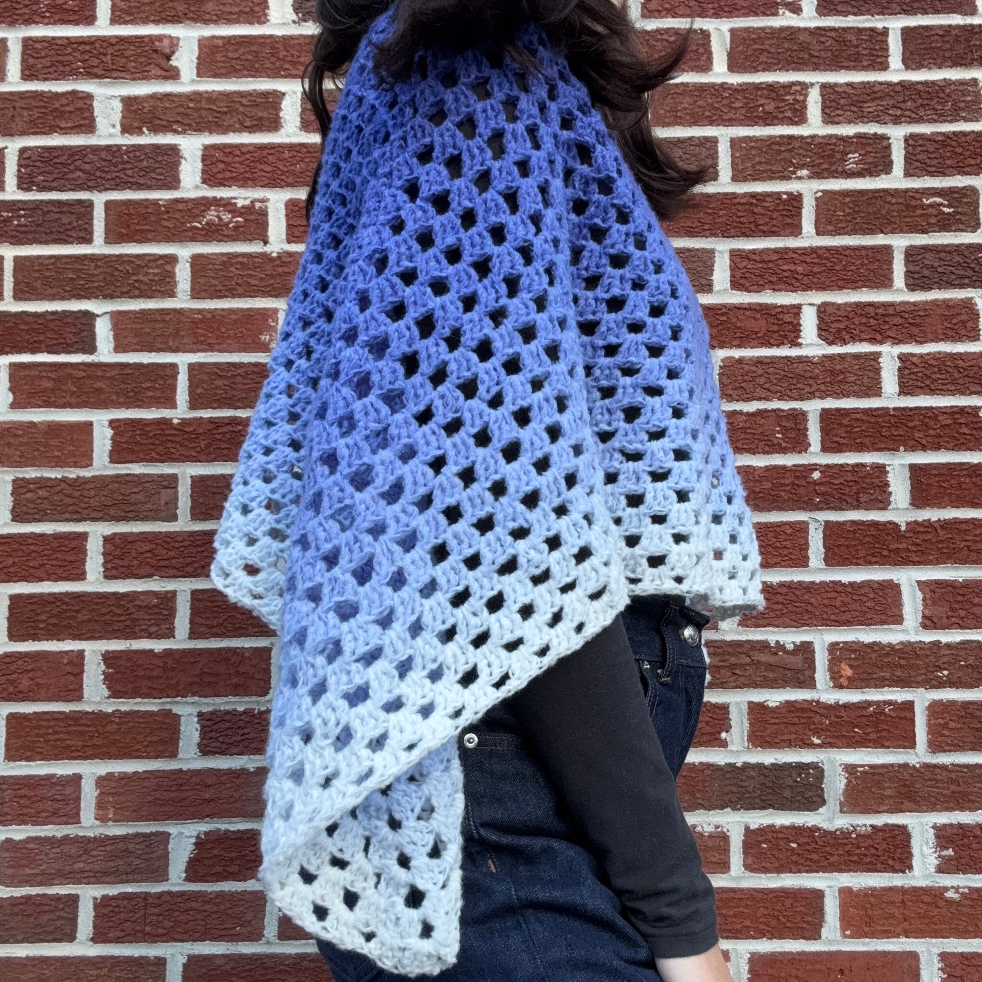 Handmade crochet poncho featuring a blue ombré that fades from rich cobalt blue at the neckline to a soft white at the hem. Cozy, lightweight, and perfect for layering as a poncho or shawl.