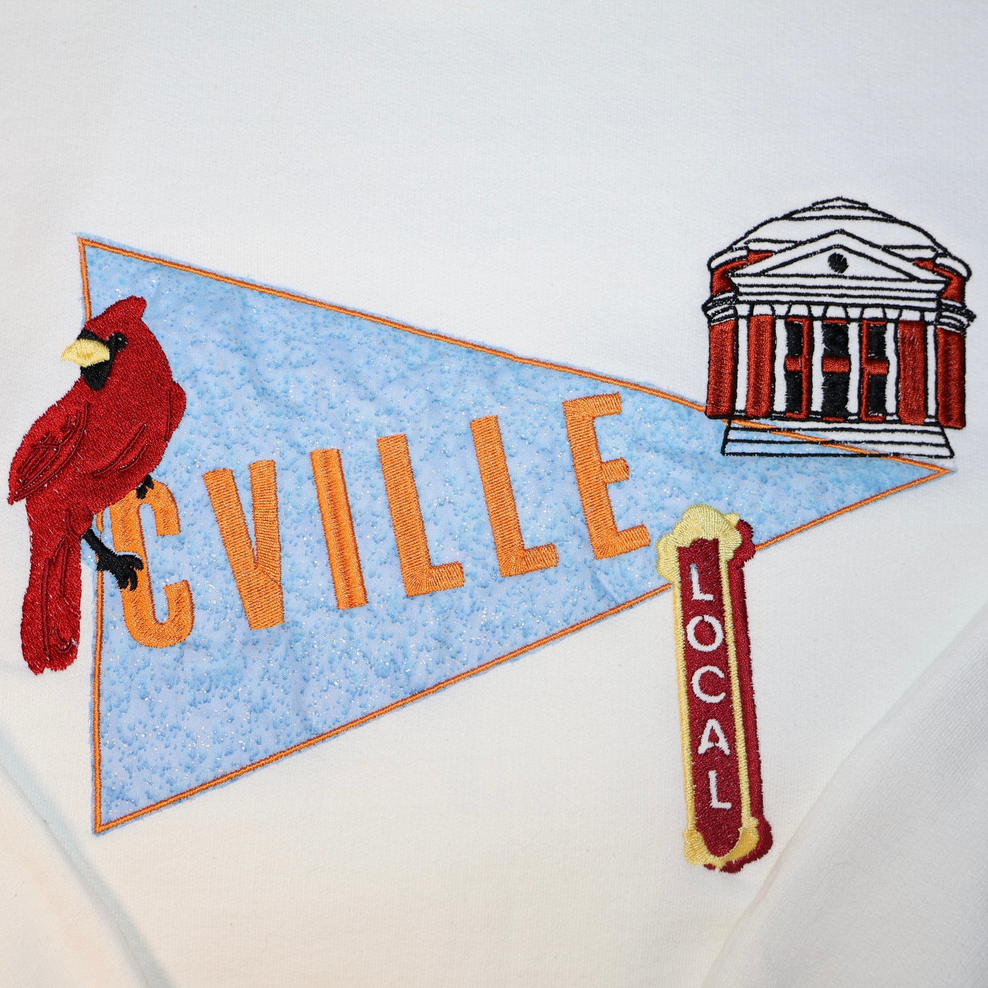 Show your love for Charlottesville with this unique embroidered sweatshirt. Featuring a handcrafted appliqué flag made with sparkly blue fabric, this design celebrates hometown pride with unique texture and detail. At the heart of the flag, “Cville” stands bold, representing the city we call home. Overlapping the flag are two of Charlottesville’s most iconic landmarks—the University of Virginia’s historic Rotunda and the Downtown Mall’s Paramount sign, reimagined with “Local” to honor the community spirit. Along with Virginia's state bird the Cardinal. Perfect for game days, strolls down the Downtown Mall, or cozy weekends.