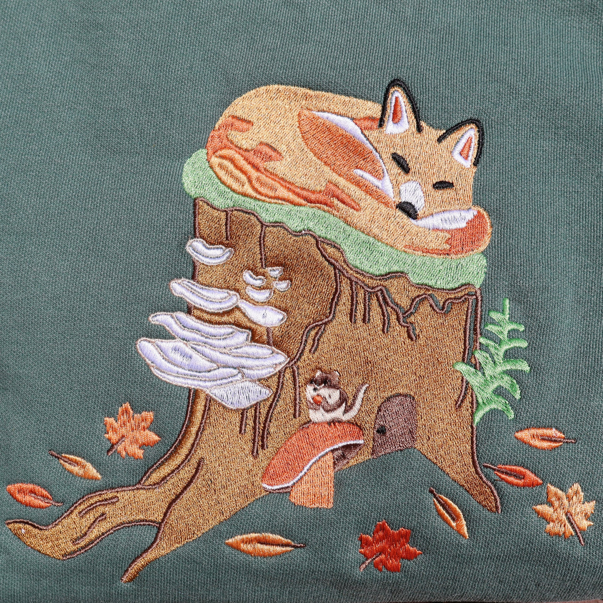 This green sweatshirt features an intricate embroidered design of a sleeping fox on top of a mossy tree stump.