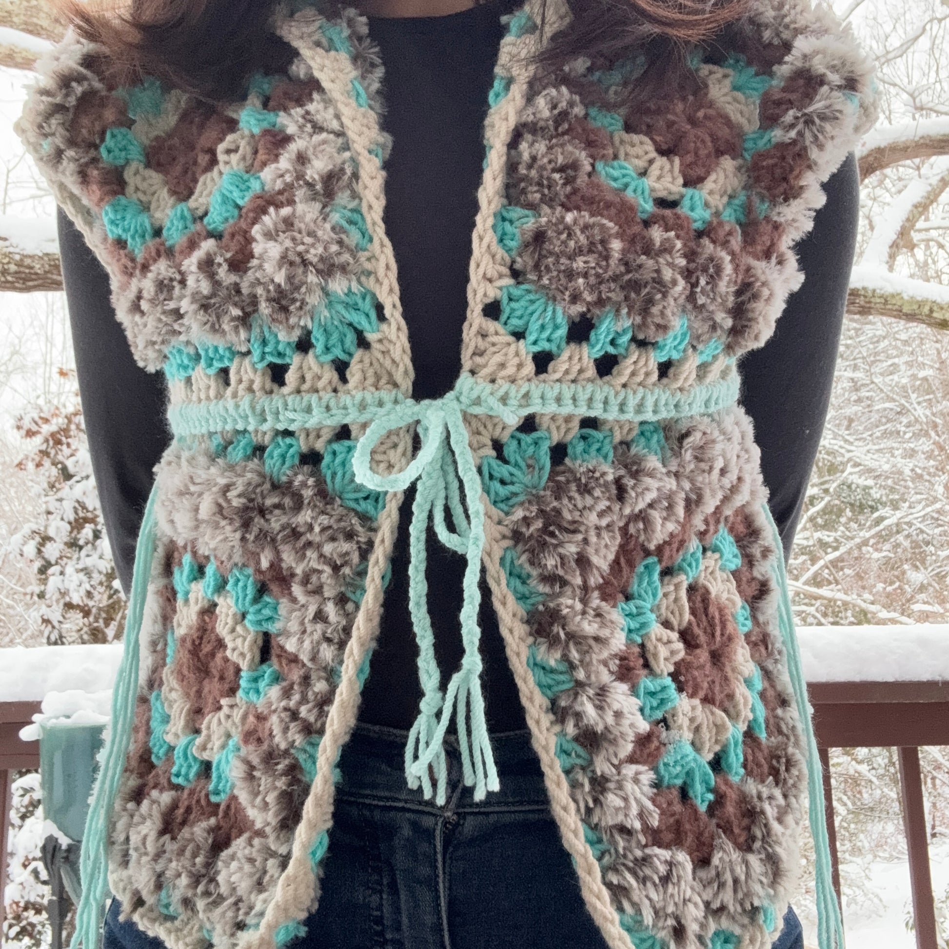 This one-of-a-kind crochet vest is lovingly handmade using a mix of classic granny squares and soft, textured yarns for a cozy yet lightweight feel. Featuring a beautiful blend of teal, brown, cream, and gray tones, this vest adds a colorful and unique touch to any outfit.