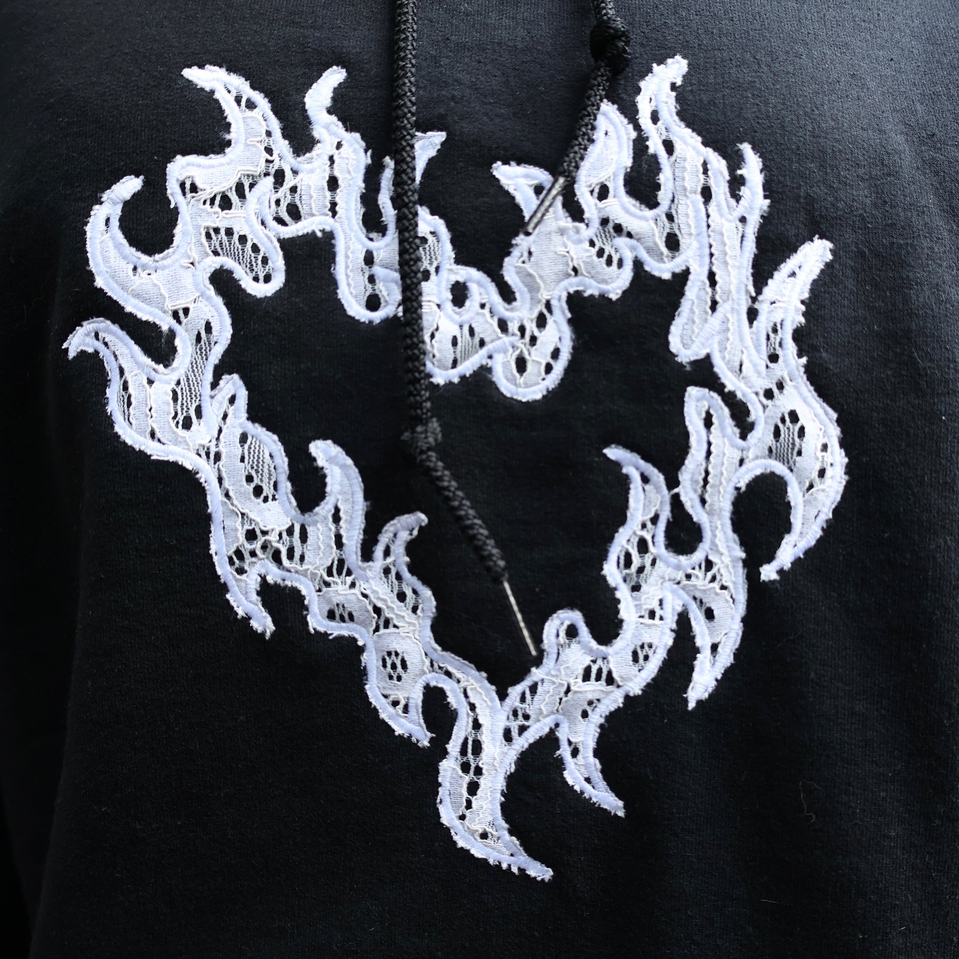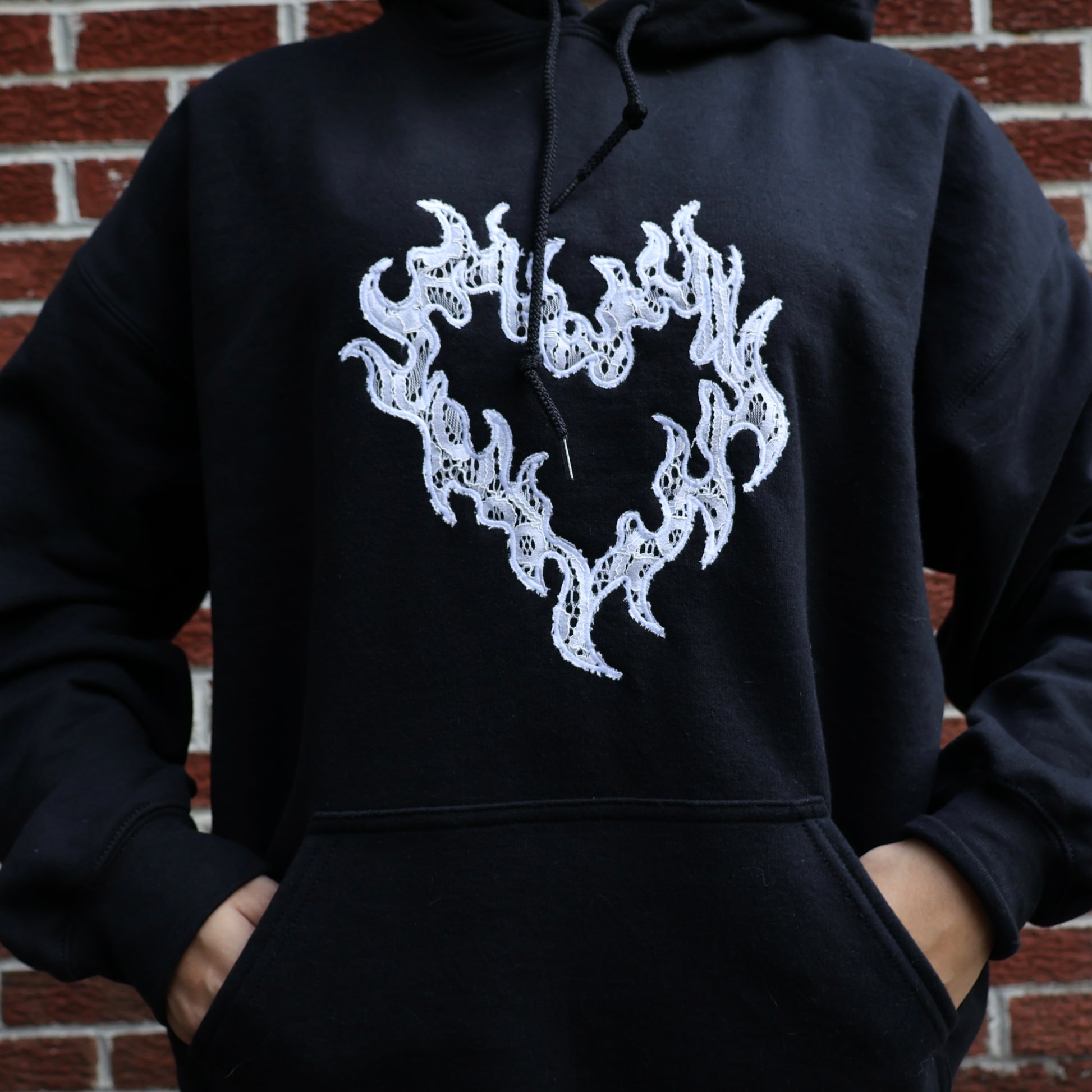 This hoodie features a striking embroidered flame heart design, enhanced with delicate lace appliqué for a bold yet romantic edge.