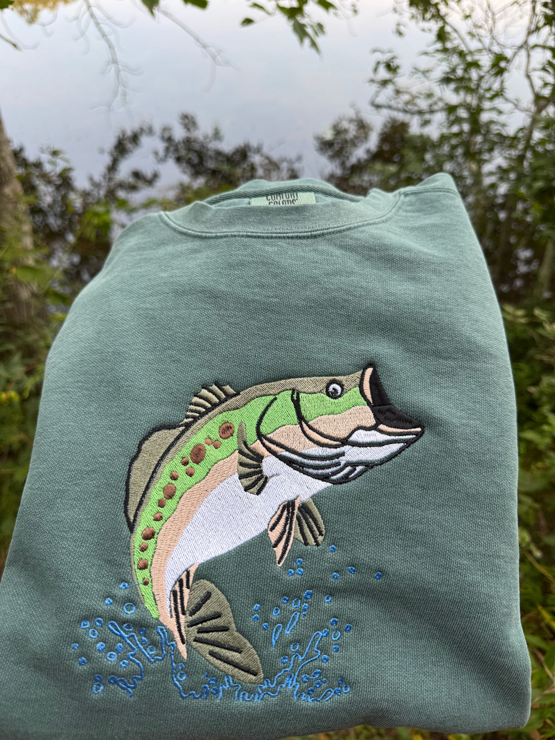 Make a splash with our Largemouth Bass Sweatshirt the perfect piece for anglers and nature lovers alike. This forest-green crewneck features an intricate embroidery of a largemouth bass leaping from the water, stitched with rich detail to bring the design to life.