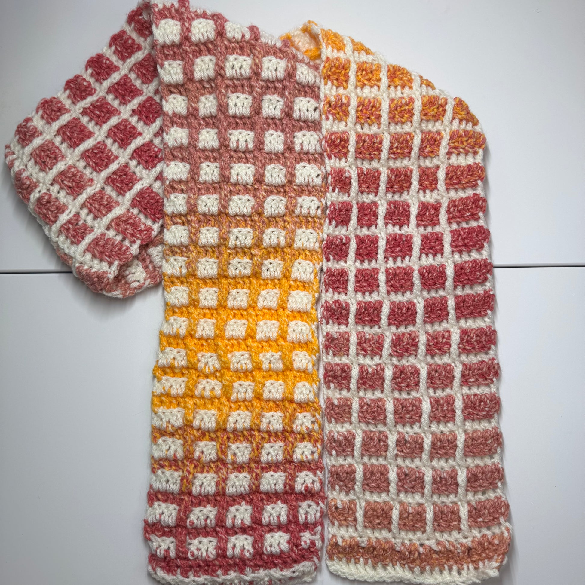 Handmade crochet scarf featuring a bold grid pattern with two looks in one. One side showcases white squares framed by a pink-to-yellow/orange gradient border, while the reverse flips to gradient squares with a crisp white border.